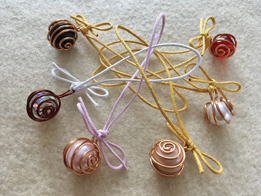 Spirálky stáčíme cca až 1 až 1,5 cm od přehnutého místa. Spirálky otočíme, aby byly nad sebou obrázek 7. Mezi spirálky vložíme korálek obrázek 8. Prsty vytvarujeme spirálky kolem korálku, aby tvořily klec obrázek 9. Pokud jsou spirálky větší rukou je tzv. „utáhneme“ v místě, kde jsme spirálky začaly stáčet.