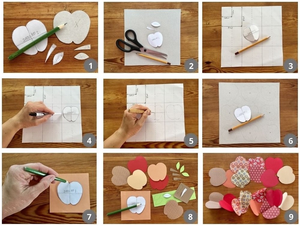 Šablonku jablíčka položíme na označený střed na kartónové podložce a lehce ji obkreslíme. Stejným způsobem naznačíme i dalších osm jablíček obrázek 06.