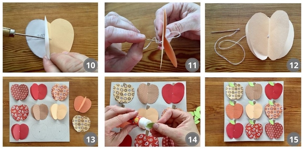 Vystříhaná jablíčka přehneme svisle napůl. Na barevné jablíčko položíme bílou šablonu jablíčka a opět jehlou (nebo šídlem) propíchneme střed. Takto to uděláme u všech ostatních jablíček obrázek 09.