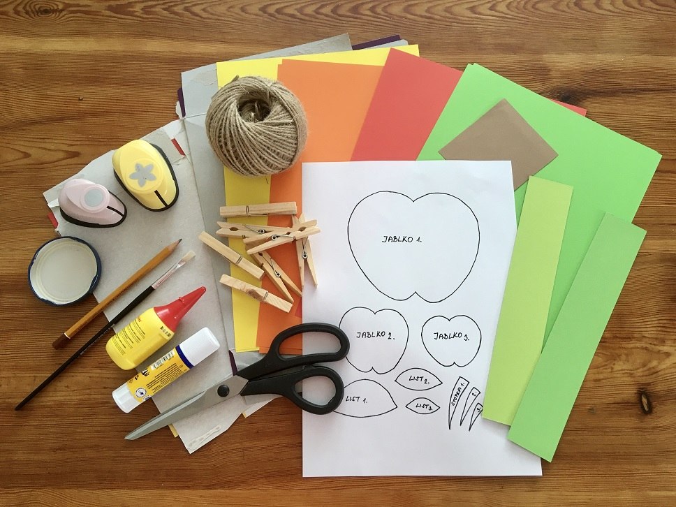 Veškerý potřebný materiál na výrobu jablíček zakoupíme v papírnictví.