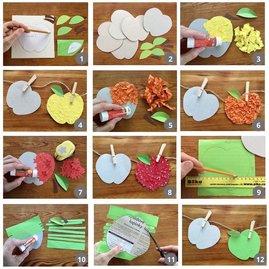 Na výrobu jablíčka potřebujeme žlutý papír, vystřižený zelený lístek a hnědou stopku. Žlutý papír natrháme na malé kousky. Část kartonového jablíčka potřeme lepidlem. Já jsem použila tuhé lepidlo. (Záleží jen na Vás jestli použijete tuhé nebo tekuté lepidlo. Vyberte si to, se kterým se Vám lépe pracuje.) Pokládáme na něj kousky natrhaného papíru. Opět potřeme část lepidlem a vyplníme natrhaným papírem. Pokračujeme dokud není zaplněné celé kartónové jablíčko. Necháme zaschnout. Jablíčko otočíme vzhůru nohama, aby opadaly špatně přilepené kousky papíru. Pokud je potřeba znovu doplníme. Stopku přilepíme na zadní stranu jablíčka. Lístek si můžeme v polovině přehnout. Bude působit víc plasticky a přilepíme obrázek 3. a 4.